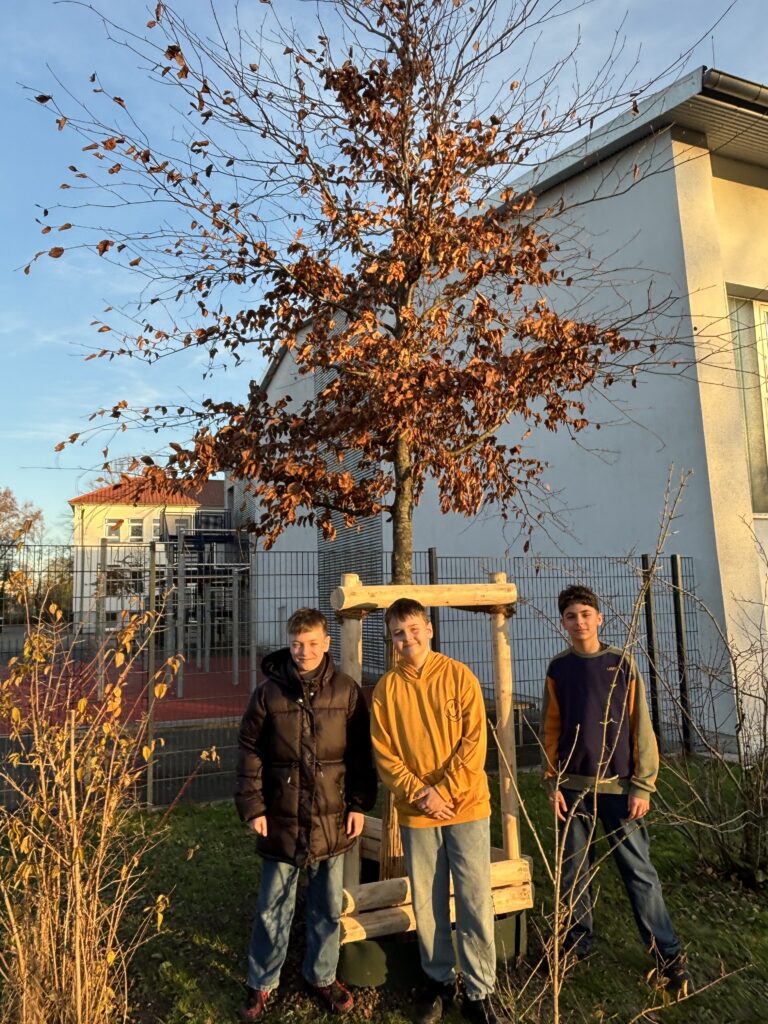 Am 4. Dezember wurde – mit tatkräftiger Unterstützung des städtischen Bauhofs – eine Blutbuche gepflanzt. Schon im kommenden Jahr wird sie Schatten spenden, das Mikroklima des Schulhofs verbessern, CO₂ binden und Sauerstoff produzieren.